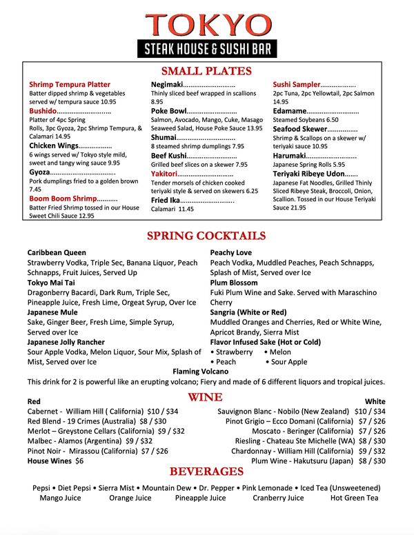 Tokyo Japanese Steakhouse Sushi Bar Menu In Claremore Oklahoma Usa